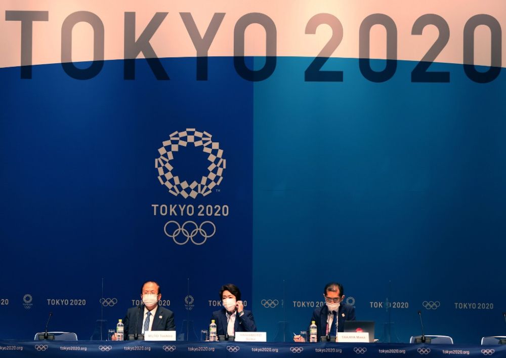 7月20日,东京奥组委主席桥本圣子(中)与东京奥组委首席执行官武藤敏郎(左)在发布会上。当日,东京奥组委在东京奥运会主新闻中心举行发布会。(新华社记者贾浩成摄)
