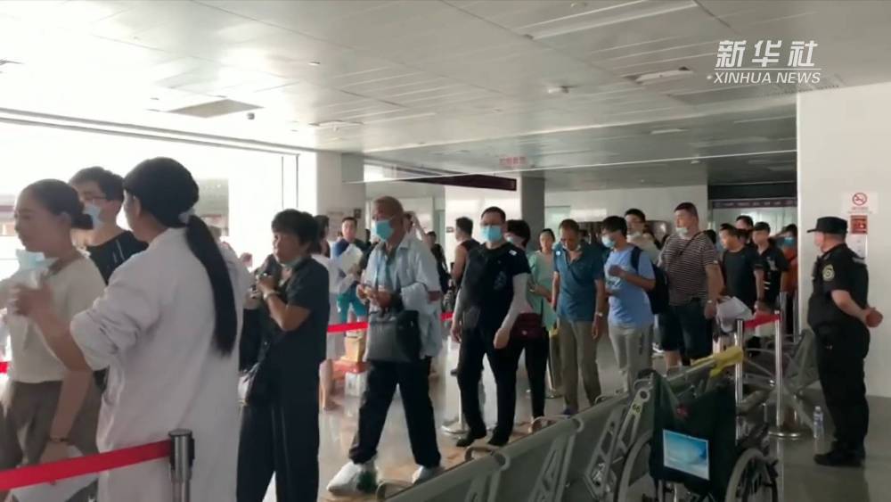 在医院救援现场,受灾群众在排队等待疏散,现场秩序较好。
