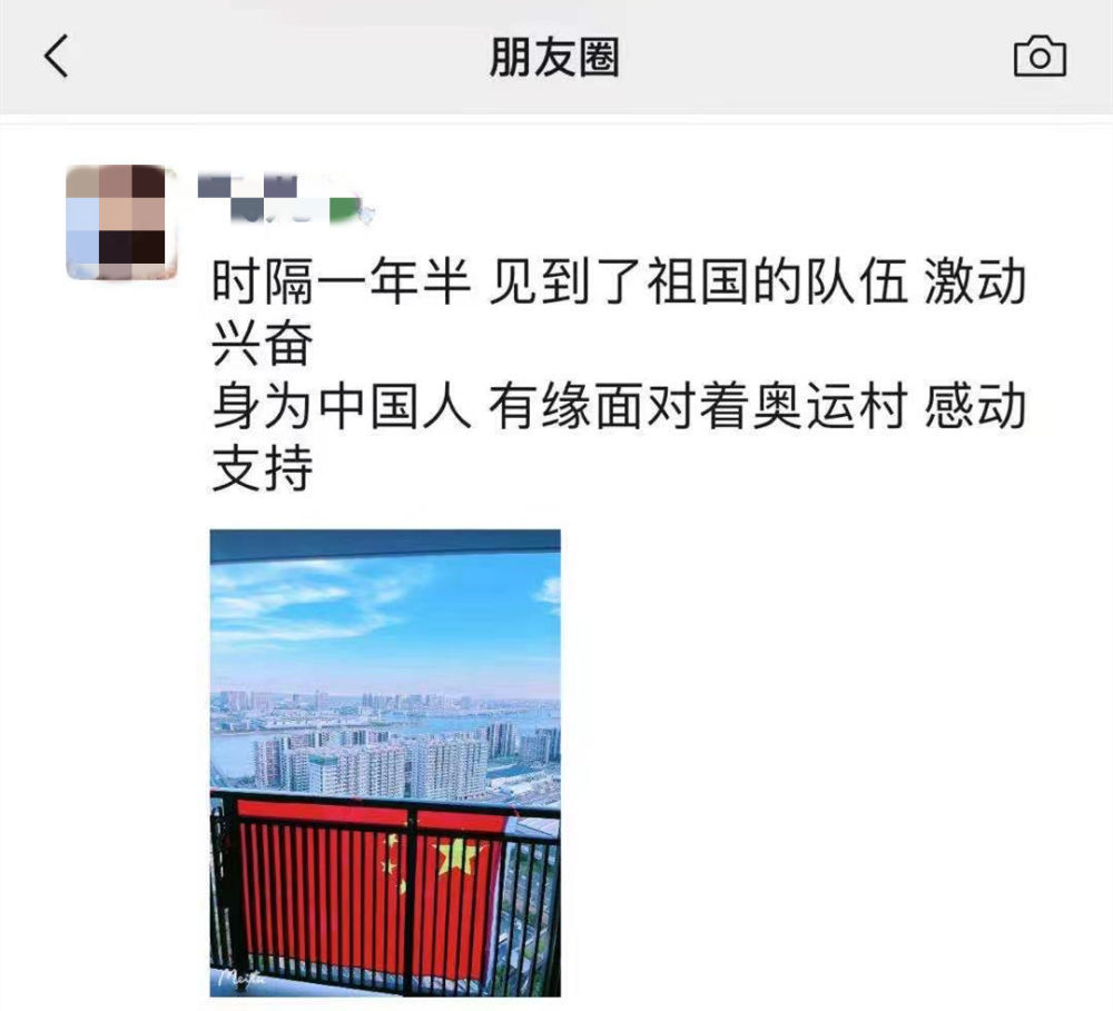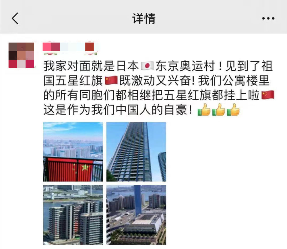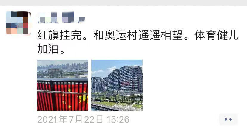 “我家对面就是东京奥运村!我们公寓楼里的中国同胞都相继把五星红旗挂上啦。”