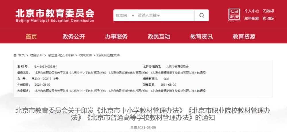 北京市教委近日发布《北京市中小学教材管理办法》,明确市、区教育行政部门和学校不统一推荐中小学教辅材料,确属教育教学所需的课堂练习、同步练习、寒暑假作业、考试试卷及复习资料等,应免费提供给学生使用。地方课程教材、校本课程教材等不得替代国家课程教材,义务教育学校不得使用境外教材。