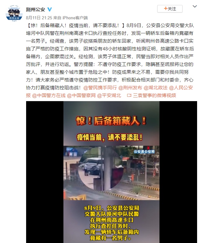8月9日,湖北省荆州市公安县公安局交警大队埠河中队民警在荆州南高速卡口执行查控任务时,发现一辆轿车后备箱内竟藏有一名男子。经调查,该男子欲搭乘朋友的轿车回家,听闻荆州各高速公路卡口实施了严格的防疫工作措施,因其没有48小时核酸阴性检测证明,故藏匿在轿车后备箱内,企图蒙混过关。经检测,该男子体温正常,民警当即对相关人员作出严厉批评,并进行劝返。警方提醒:不遵守防疫工作要求,隐瞒甚至谎报将让您的家人、朋友甚至整个城市置于危险之中!防疫成果来之不易,需要你我共同努力!请大家务必严格遵守疫情防控工作要求,积极配合相关部门和村委会,齐心协力打赢疫情防控阻击战!
