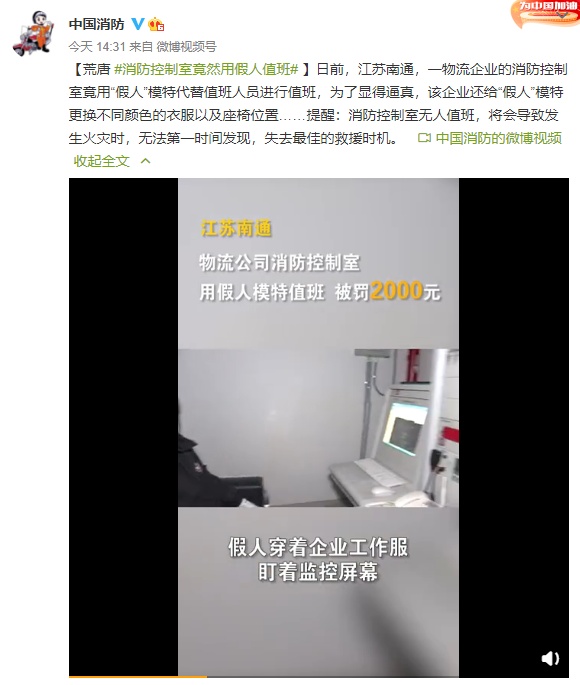 【荒唐!消防控制室竟然用假人值班】日前,江苏南通,一物流企业的消防控制室竟用“假人”模特代替值班人员进行值班,为了显得逼真,该企业还给“假人”模特更换不同颜色的衣服以及座椅位置……提醒:消防控制室无人值班,将会导致发生火灾时,无法第一时间发现,失去最佳的救援时机。