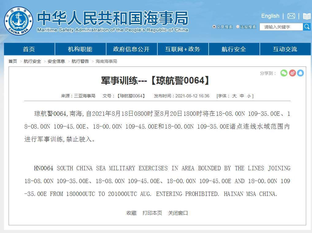 中华人民共和国海事局近日发布航行警告,具体内容如下:琼航警0064,南海,自2021年8月18日8时至8月20日18时将在18-08.00N 109-35.00E、18-08.00N 109-45.00E、18-00.00N 109-45.00E和18-00.00N 109-35.00E诸点连线水域范围内进行军事训练,禁止驶入。