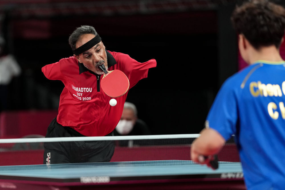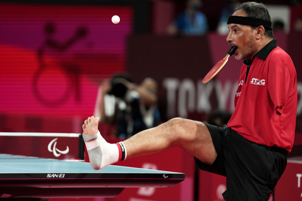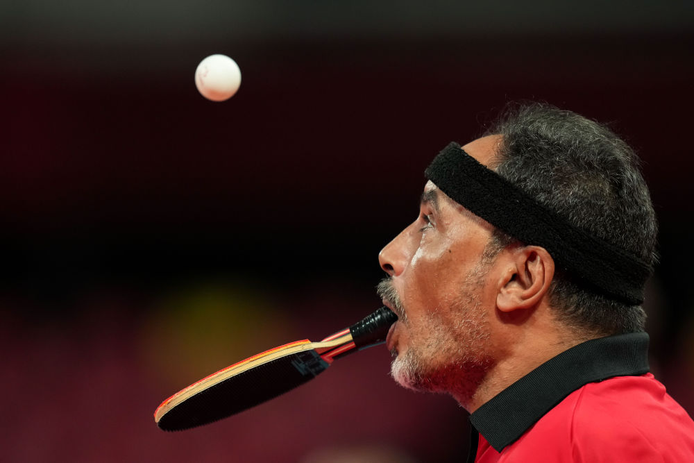 脚趾夹住乒乓球,用力抛向空中,嘴咬着球拍,甩头击球——48岁的无臂运动员易卜拉欣·哈马托无数次重复着这样的发球动作,他是东京残奥会上唯一用嘴打乒乓球的运动员。