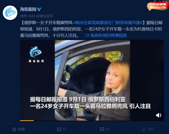 据每日邮报报道,9月1日,俄罗斯西伯利亚,一名24岁女子开车载一头名为托普地日卡的喜马拉雅熊兜风,十分引人注目。