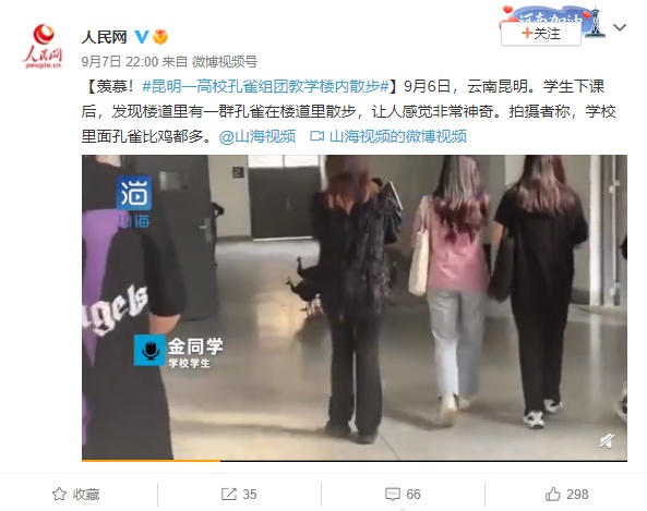 羡慕!昆明一高校孔雀组团教学楼内散步