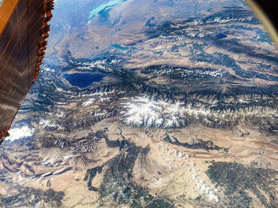 在太阳翼帆板与深邃宇宙所构成的夹角中,一条碧绿的玉带温柔的铺在亚欧大陆上,这是“世界第四长湖”巴尔喀什湖,中国新疆的伊犁河自南而北注入巴尔喀什湖西部,使这条“中亚玉带”呈现出西淡东咸的一湖两水现象。照片左下角,深不见底的伊塞克湖如同一颗蓝色的宝石深居在亚欧大陆的中心,一旁的雪山紧紧环绕,小心翼翼地将这美丽的湖泊从高原戈壁中轻轻托起。