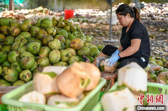 一妇女对鲜食椰子进行粗加工。 骆云飞 摄