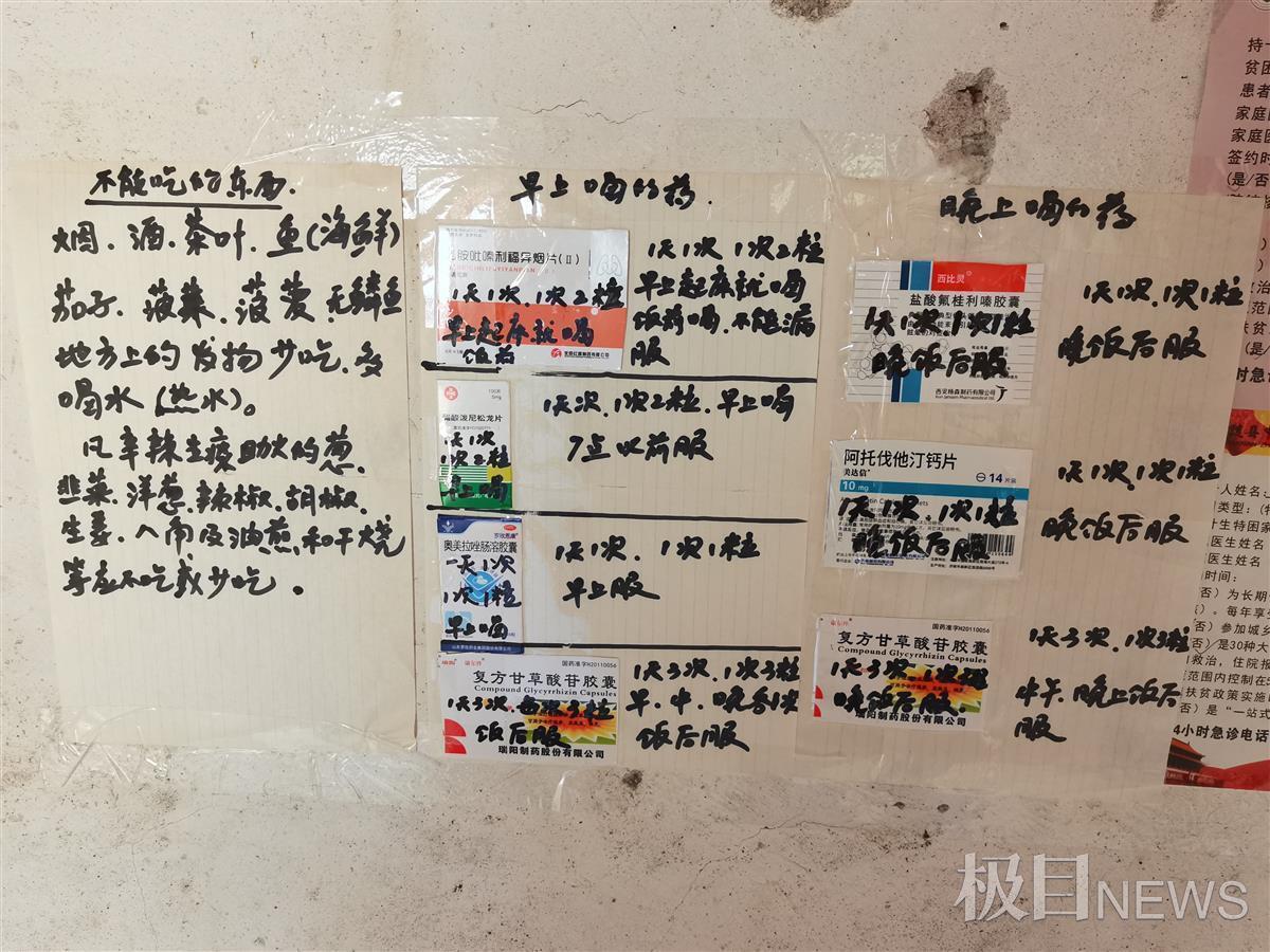 在老人家的墙上,记者看到王文艮给老人制作的“喝药提示”和“忌口提示”,哪种药一天吃几次,早上吃多少,中午、晚上吃多少,吃药期间哪些东西不能吃等情况一目了然。