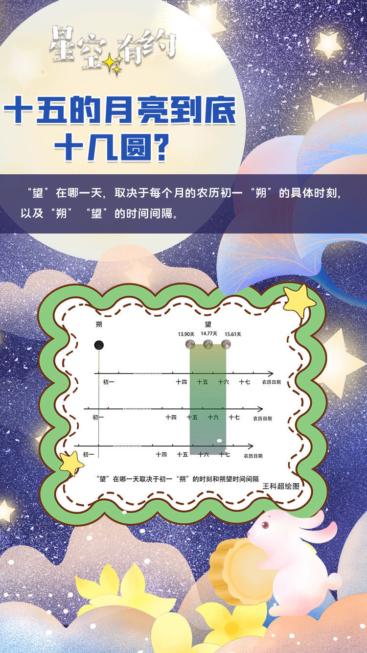 王科超举例说,如果某农历月里,朔望间隔比较长,如15.1天,同时该月的朔发生在朔日接近日末的时刻,该月的望就在农历十七。反之,若某农历月中朔望间隔较短,如13.95天,同时该月的朔极其接近朔日日首,则该月的望就在农历十四,出现“十五的月亮十四圆”这一较为罕见的情况。