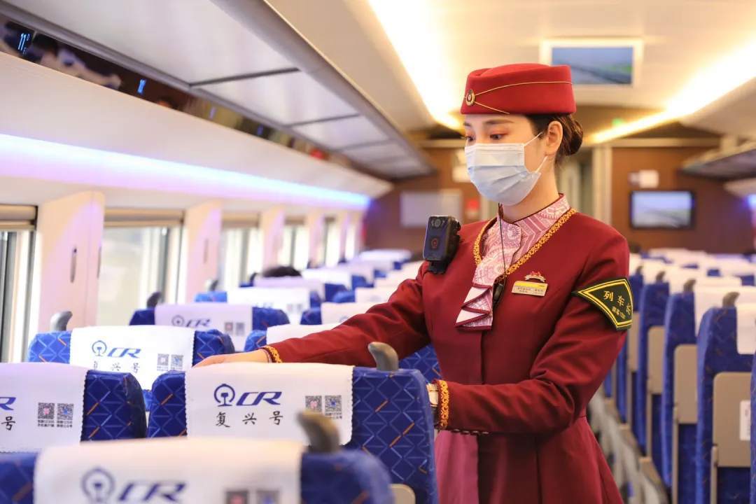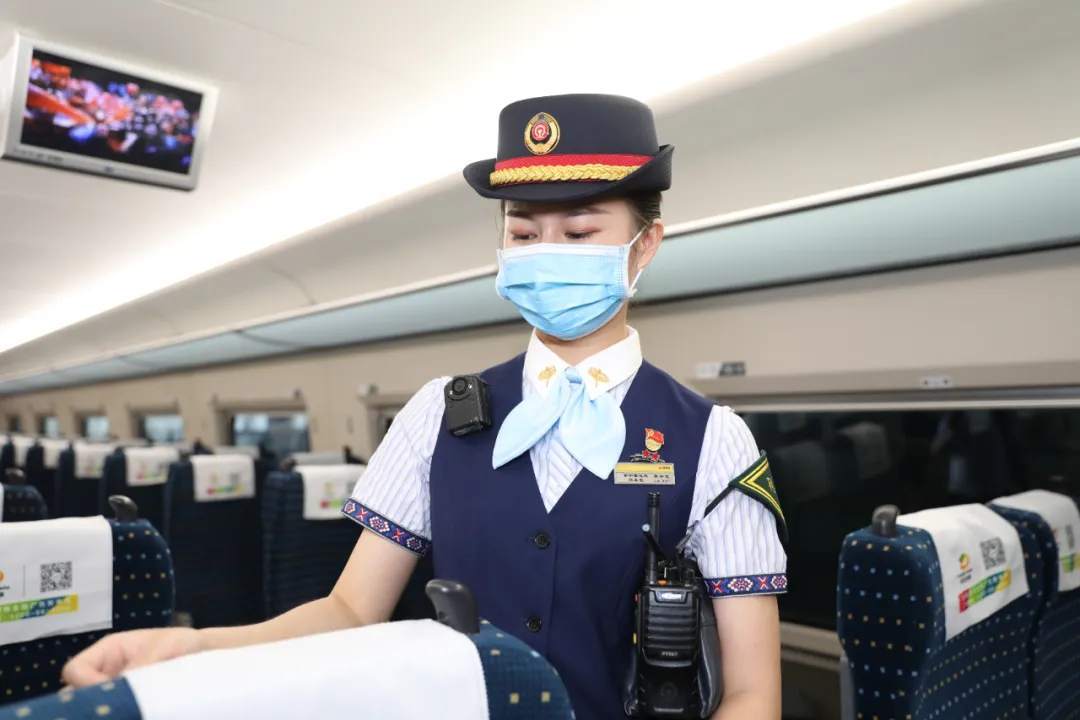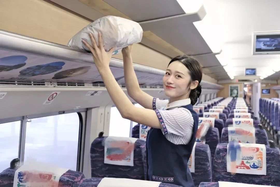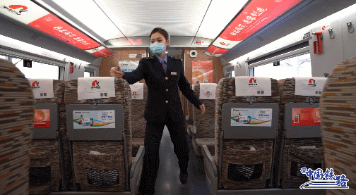当动车组列车终到后,司机只需要走到另一端车头上岗,即可完成列车换向运行。列车员这时候就要手动调整座椅方向,她们只需轻轻一踩这个小踏板,座椅靠背就会回弹,此时,再握住座椅上方的黑色把手,用力一甩、一摆,座椅换向就完成了。