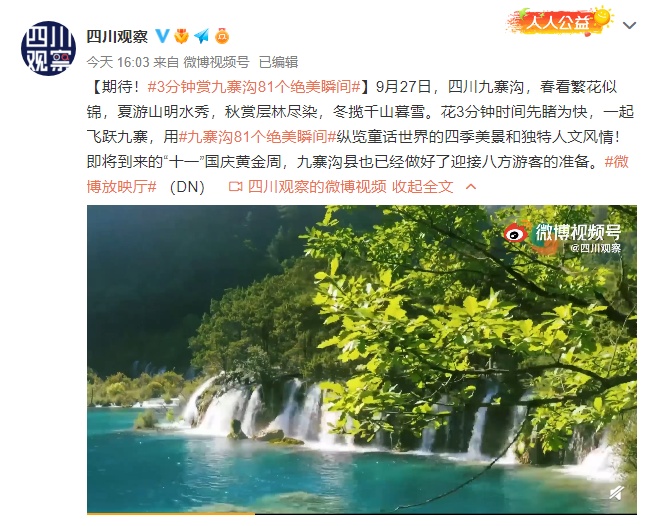 9月27日,四川九寨沟,春看繁花似锦,夏游山明水秀,秋赏层林尽染,冬揽千山暮雪。花3分钟时间先睹为快,一起飞跃九寨,用九寨沟81个绝美瞬间纵览童话世界的四季美景和独特人文风情!即将到来的“十一”国庆黄金周,九寨沟县也已经做好了迎接八方游客的准备。