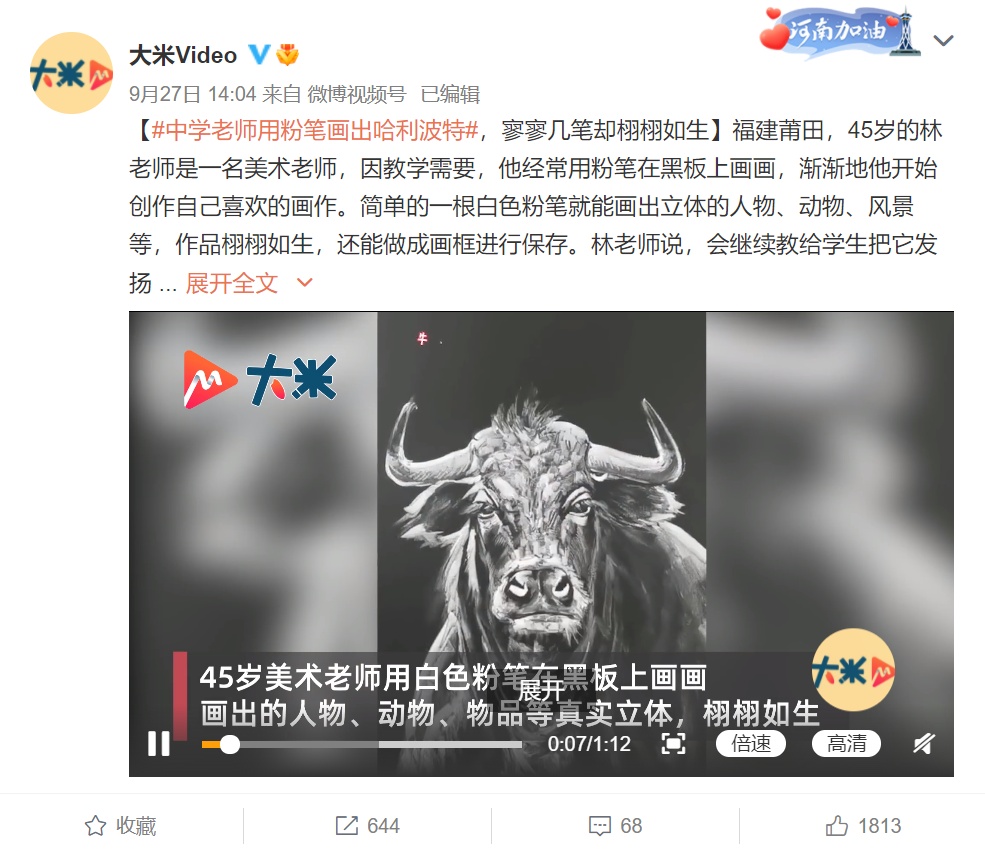 福建莆田,45岁的林老师是一名美术老师,因教学需要,他经常用粉笔在黑板上画画,渐渐地他开始创作自己喜欢的画作。简单的一根白色粉笔就能画出立体的人物、动物、风景等,作品栩栩如生,还能做成画框进行保存。林老师说,会继续教给学生把它发扬光大。
