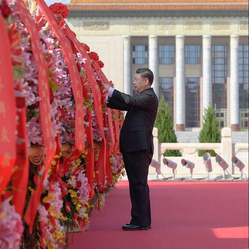 ▲2020年9月30日上午,党和国家领导人习近平、李克强、栗战书、汪洋、王沪宁、赵乐际、韩正、王岐山等来到北京天安门广场,出席烈士纪念日向人民英雄敬献花篮仪式。这是习近平整理花篮上的缎带。新华社记者 申宏 摄