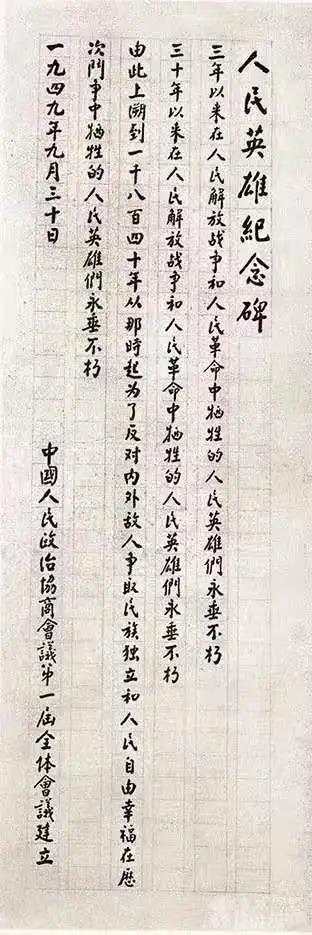 为了写好碑文,周恩来总理每天晨起的第一件事就是要写一遍碑文,前前后后共书写了40余遍,最后挑选出他认为最满意的一幅。写好后,他把碑文手稿亲自送到人民英雄纪念碑建设工地向雕塑大家刘开渠请教。