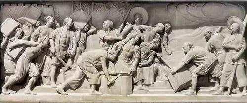 这座庄严巍峨的纪念碑总高度37.94米,比天安门还高出4.24米,有17000多块花岗石和汉白玉砌成,纪念碑碑座上8组10幅浮雕分别展现了中国近现代史上虎门销烟、金田起义、武昌起义、五四运动、五卅运动、八一南昌起义、抗日战争、胜利渡长江、支援前线、欢迎人民解放军等历史场景。
