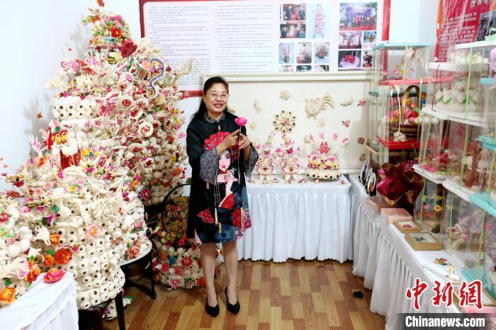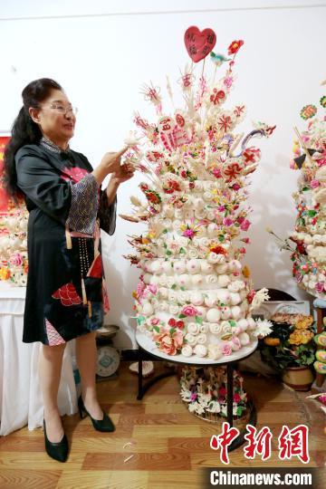 中新网西安10月2日电 (记者 张远)“此花馍高约1.2米,用了50斤面粉花费十余天捏制而成。”岳若惠2日在位于陕西省咸阳市的工作间内告诉记者,这个名为“祝福祖国”的花馍是为了迎接国庆节而创作。