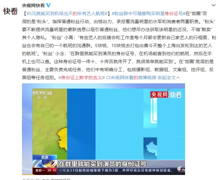 在“饭圈”顶层的是“粉头”,指挥普通粉丝行动,出钱出力,承担着流量明星的水军和消费者两重职责。“粉头”要不断提供流量明星的最新信息以吸引普通粉丝,他们想尽办法获取该明星的近况,不惜“贩卖”其个人隐私。 “粉丝” 小高:“有些艺人的后援会和工作室每个月都会更新自己家艺人的行程图,粉丝也会有自己的一个航班的沟通群。5块钱、10块钱去打包出售今天整个上海出发和到达的艺人的航班”。“粉丝” 小念:“在群里就能买到演员的身份证号,在机场能查到他们的航班,然后在手机上也可以查。这种身份证号一传十、十传百就传开了,就很简单就能买到”。在“饭圈”底层的是普通粉丝,主要负责完成任务,他们中有明确分工,包括摄影组、数据组、文案组、控评组、反黑组等任务组别。