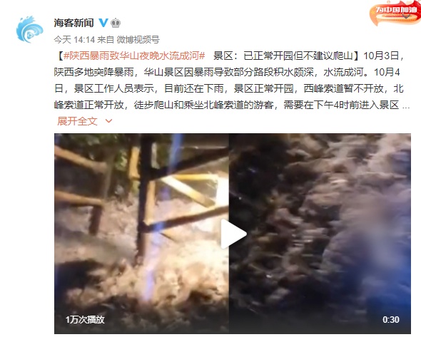 10月3日,陕西多地突降暴雨,华山景区因暴雨导致部分路段积水颇深,水流成河。10月4日,景区工作人员表示,目前还在下雨,景区正常开园,西峰索道暂不开放,北峰索道正常开放,徒步爬山和乘坐北峰索道的游客,需要在下午4时前进入景区,但不建议大家爬山。