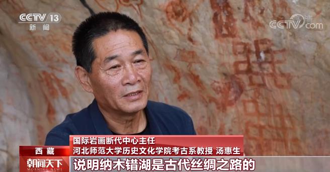河北师范大学历史文化学院考古系教授 国际岩画断代中心主任 汤惠生:我们这次新发现了在很多岩画的人物风格上,不仅有早期藏族的风格,还有汉字的题记,说明纳木错湖是古代丝绸之路的一个重要的通道,融合了不同文化的风格。