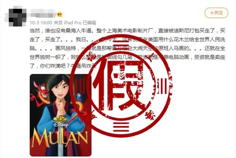 10月3日,有微博网友发帖称:“整个上海美术电影制片厂,直接被迪士尼打包买走了”。他给出的理由是,“迪士尼的作品《花木兰》是由《大闹天宫》原班人马制作而成”,帖文还配了一张《花木兰》的电影海报。