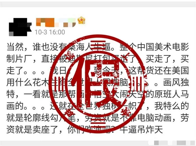 △该网友此前还造谣称“整个中国美术电影制片厂,直接被迪士尼打包买走了”。