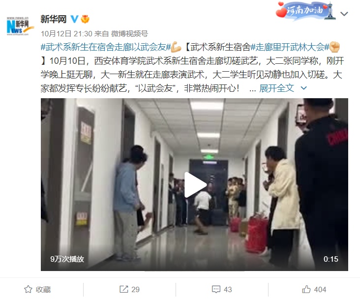 【武术系新生宿舍走廊里开武林大会】10月10日,西安体育学院武术系新生宿舍走廊切磋武艺,大二张同学称,刚开学晚上挺无聊,大一新生就在走廊表演武术,大二学生听见动静也加入切磋。大家都发挥专长纷纷献艺,“以武会友”,非常热闹开心!