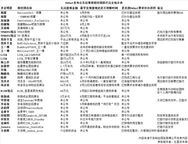 有不同明星的粉丝团先后发声称,他们在Owhat平台上的资金无法提现,平台以各种理由拖欠。目前,有粉丝团表示已经报警。