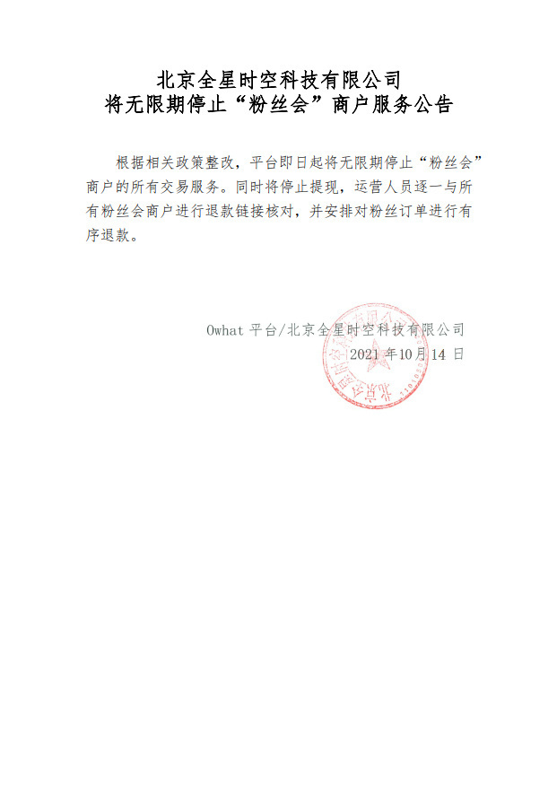直到今年10月14日深夜23时许,Owhat平台在官方微博发布公告称,即日起将无限期停止“粉丝会”商户(粉丝团)的所有交易服务。同时停止提现,运营人员逐一与所有粉丝会商户进行退款链接核对,并安排对粉丝订单进行有序退款。