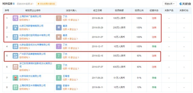 值得一提的是,自2020年11月至今年7月,全星时空对外投资的公司中共有4家公司的状态改为“已注销”,包括北京全星时空网络技术有限公司(持股100%)、上海欧妹广告有限公司(持股100%)、广州欧沃品牌营销有限公司(持股60%)和北京艾克斯营销有限公司(持股100%)。