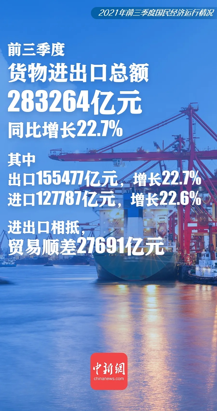 官方数据显示,前三季度,货物进出口总额283264亿元(人民币,下同),同比增长22.7%。其中,出口155477亿元,增长22.7%;进口127787亿元,增长22.6%。