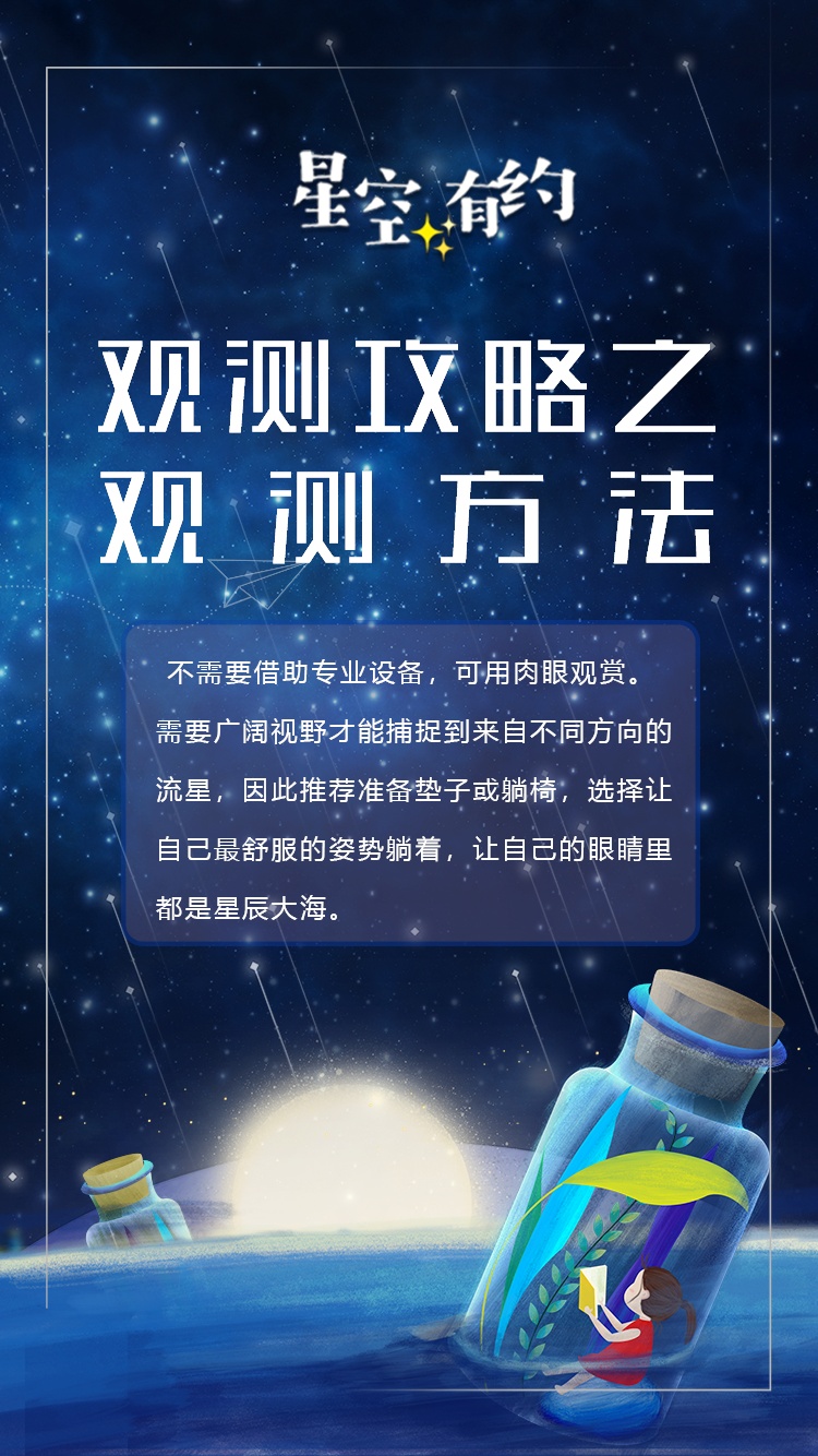 王科超表示,看流星雨不需要借助专业设备,可用肉眼观赏。流星雨有“自己的想法”,可能从天空任意地方出现,需要广阔视野才能捕捉到来自不同方向的流星。如果借助器械观赏,视野较小,比较容易错过它们。因此推荐准备垫子或躺椅,选择最舒服的姿势躺着,让自己的眼睛里都是星辰大海。这样视野开阔,也能舒服地观赏流星雨。