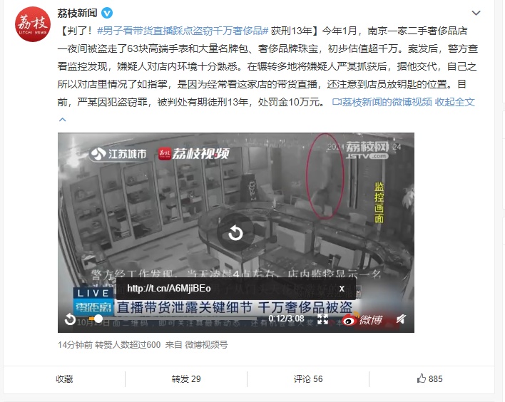 今年1月,南京一家二手奢侈品店一夜间被盗走了63块高端手表和大量名牌包、奢侈品牌珠宝,初步估值超千万。案发后,警方查看监控发现,嫌疑人对店内环境十分熟悉。在辗转多地将嫌疑人严某抓获后,据他交代,自己之所以对店里情况了如指掌,是因为经常看这家店的带货直播,还注意到店员放钥匙的位置。目前,严某因犯盗窃罪,被判处有期徒刑13年,处罚金10万元。