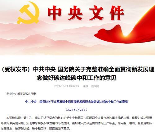 据新华社10月24日消息,中共中央、国务院日前印发的《关于完整准确全面贯彻新发展理念做好碳达峰碳中和工作的意见》24日发布。在加强绿色低碳重大科技攻关和推广应用方面,《意见》明确提出,制定科技支撑碳达峰、碳中和行动方案,编制碳中和技术发展路线图。采用“揭榜挂帅”机制,开展低碳零碳负碳和储能新材料、新技术、新装备攻关。