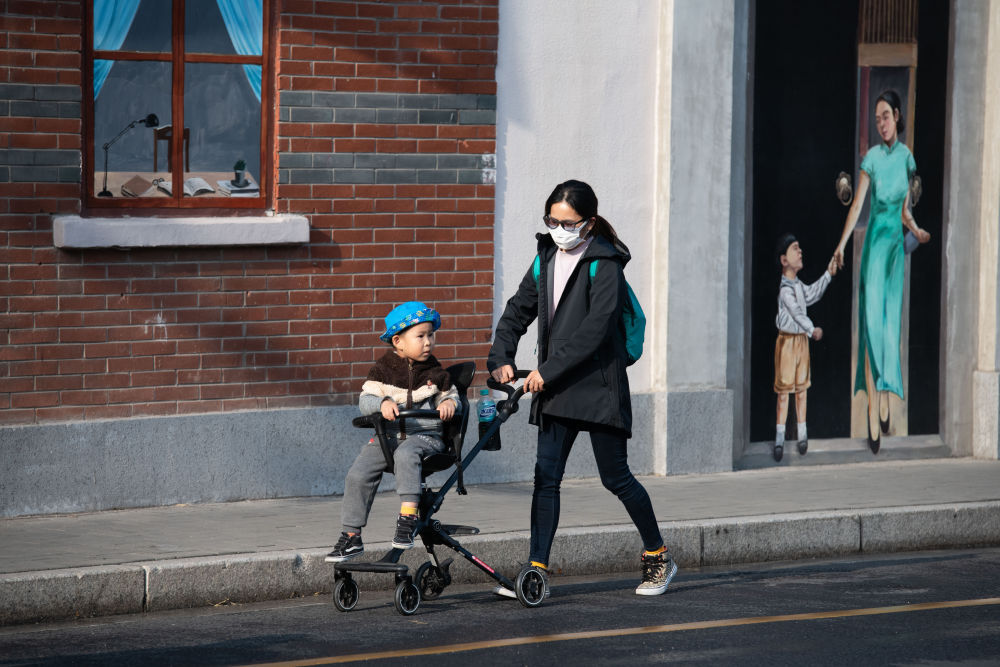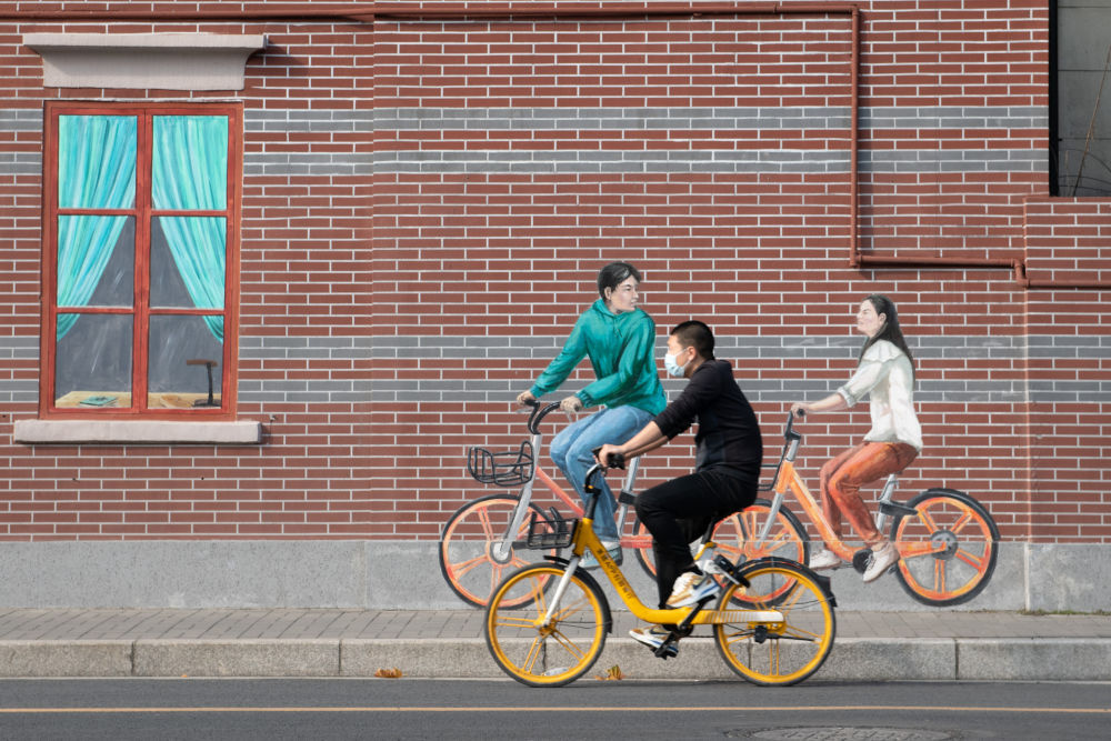 11月3日,在上海市静安区平德里,行人从墙绘作品前骑车经过。新华社记者 孟涛 摄