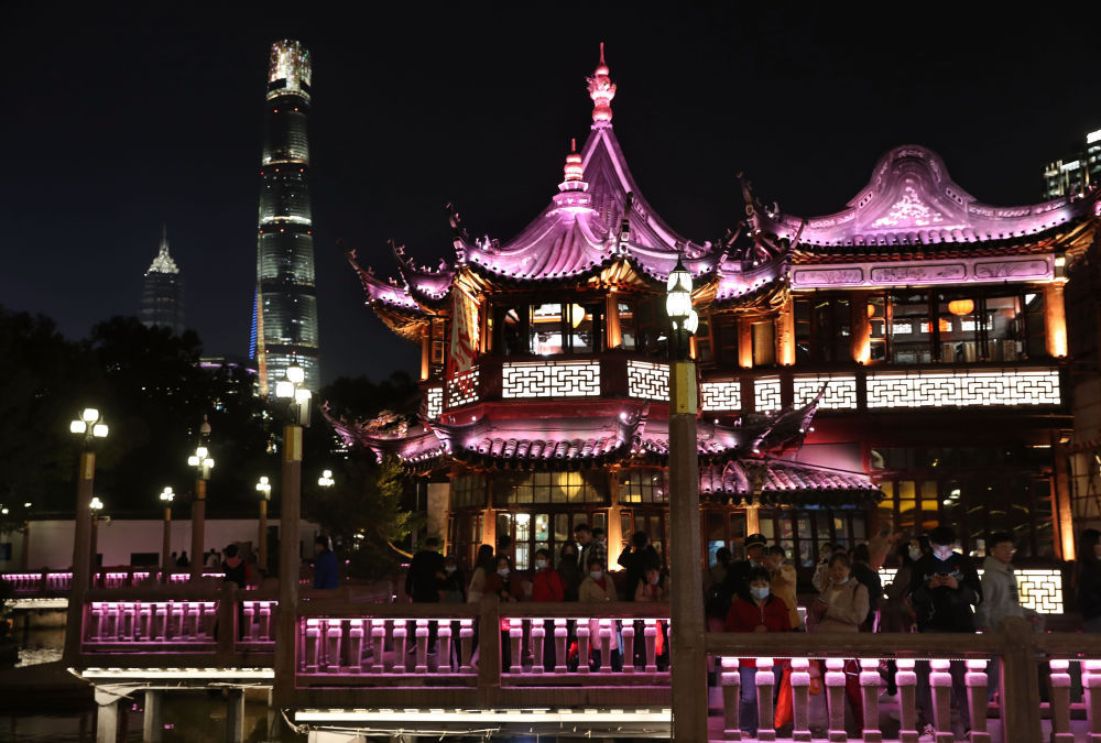 11月3日拍摄的上海豫园九曲桥的夜景。新华社记者 刘颖 摄