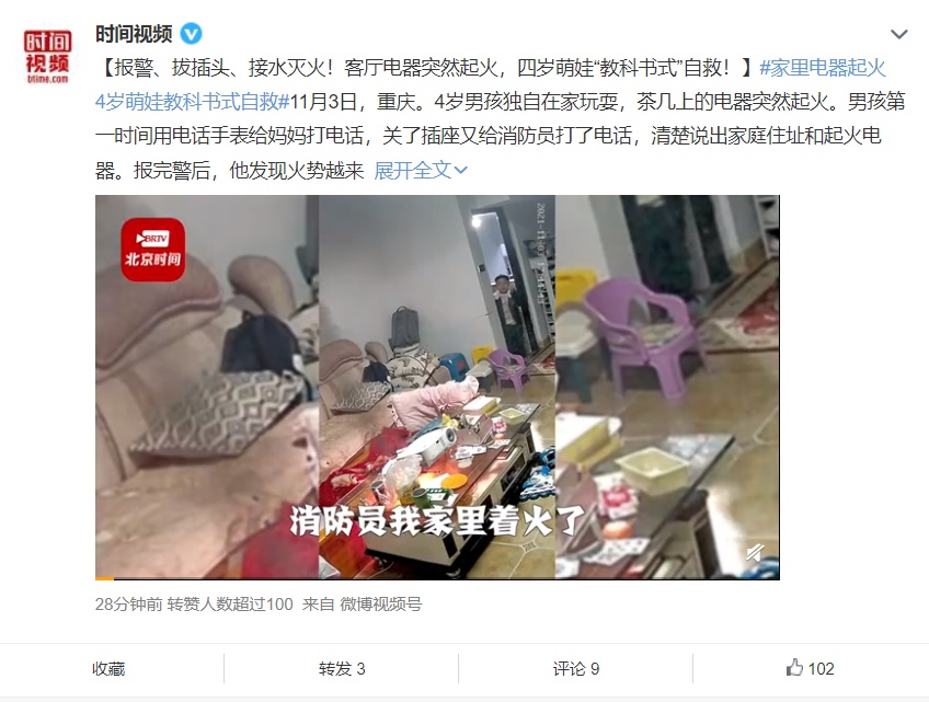 【报警、拔插头、接水灭火!客厅电器突然起火,四岁萌娃“教科书式”自救!】11月3日,重庆。4岁男孩独自在家玩耍,茶几上的电器突然起火。男孩第一时间用电话手表给妈妈打电话,关了插座又给消防员打了电话,清楚说出家庭住址和起火电器。报完警后,他发现火势越来越大,便关掉开关,拔下插头,用桶接水灭火。消防员赶到后发现,因处置及时,火势没有蔓延,男孩也未受伤。