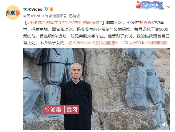 湖南武冈,91岁的杨克兴爷爷离世,捐献角膜、器官和遗体。杨爷爷生前经常参与公益捐款,每月退休工资3000元的他,曾连续8年资助一对兄弟到大学毕业。他曾对子女说,我的钱我留着自己有用处,不会给子女的。