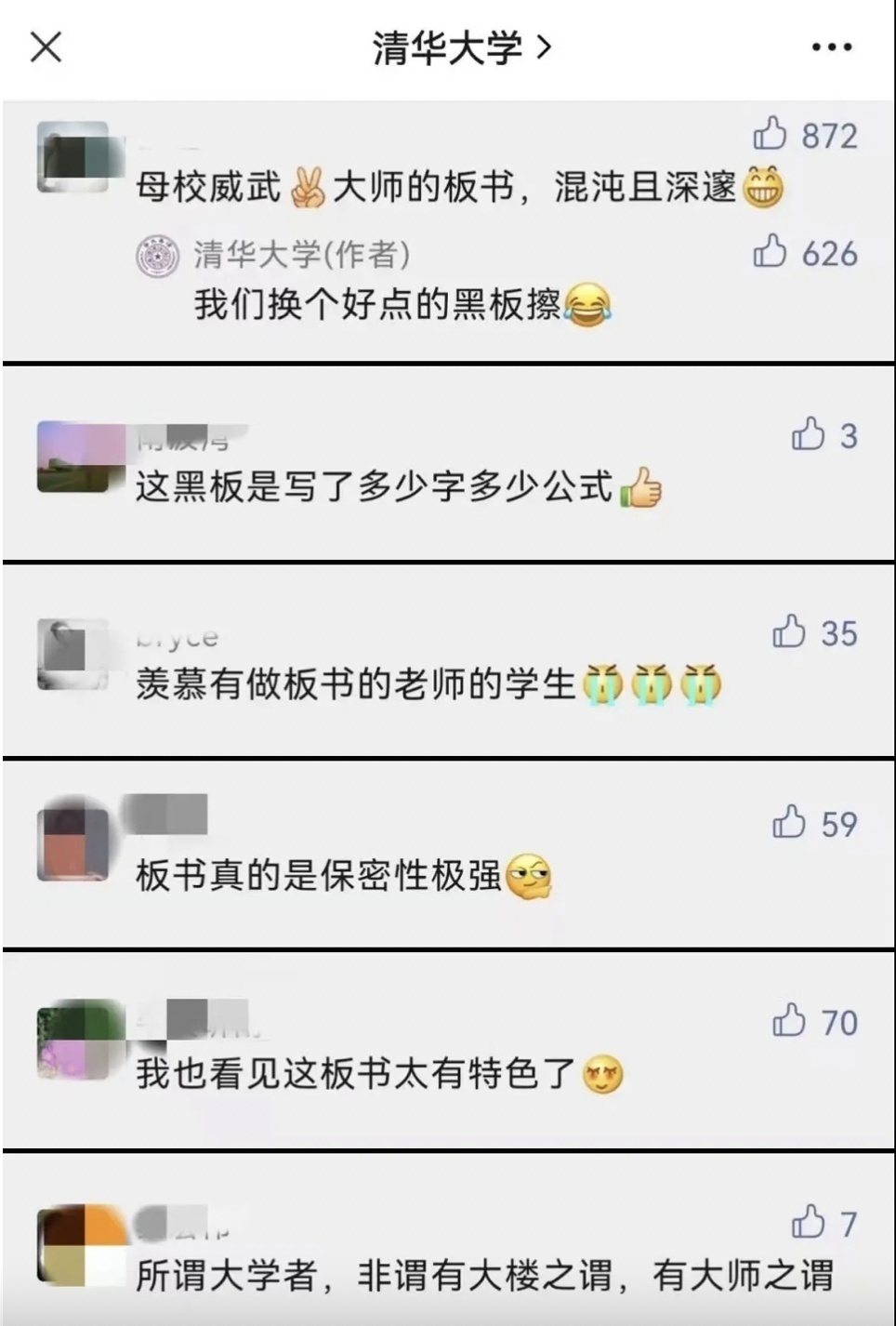 这堂课的学生、清华大学数学中心博士后唐鑫星表示,因为每节课板书内容都很多,“就如大家看到的那样,那是擦完几次黑板后的样子”。