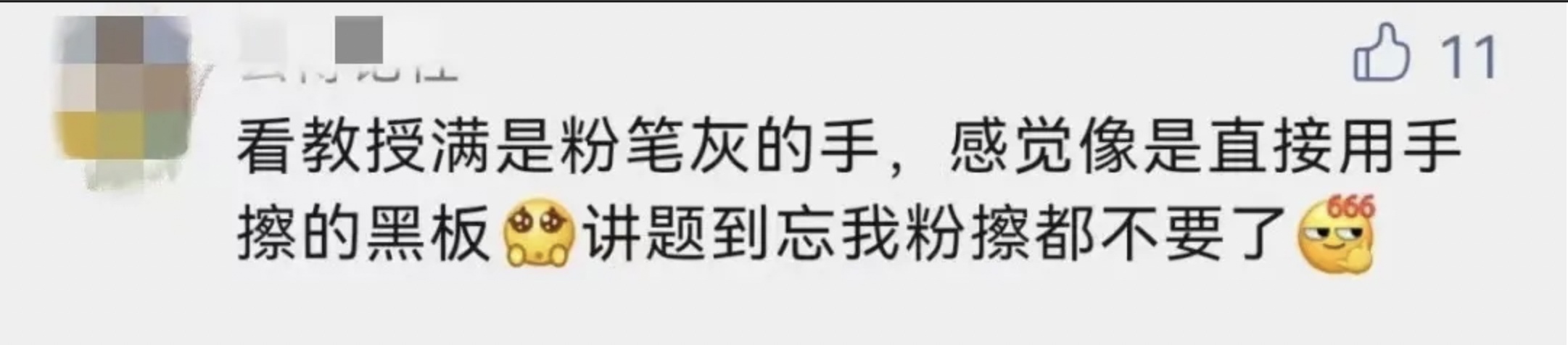 有网友注意到,教授讲课时手上有很多粉笔灰。唐鑫星说,这是“就近取材”,“搞数学的都喜欢这么干”——有时直接用手擦黑板。