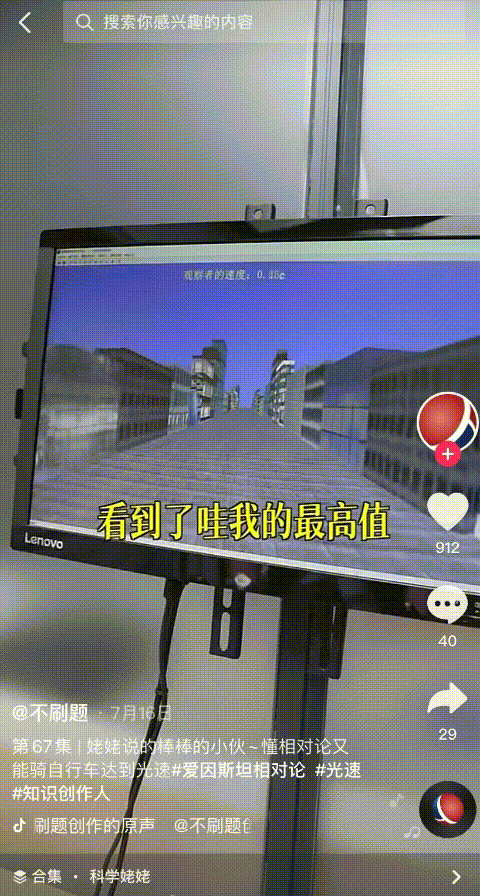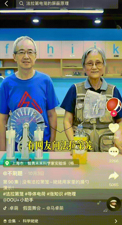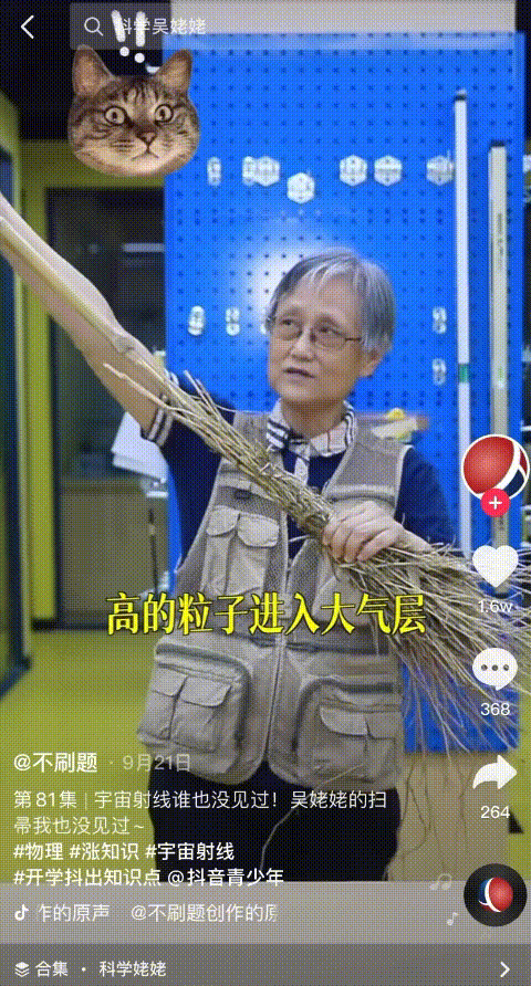 吴姥姥本名吴於人,今年72岁。从同济大学退休后,一直专注物理科普。在吴姥姥的短视频里,一切科学原理都变得可爱生动。爱因斯坦的相对论不好理解,她一边骑自行车一边展示相对论视觉效应。宇宙射线谁也没见过,她用一把扫把就带大家了解了它的轨迹。