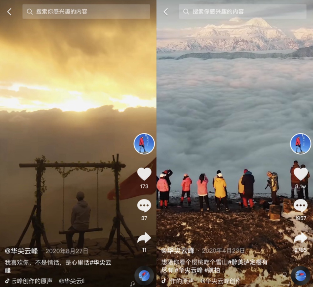 偶然的机会,任显侨在抖音上传了自己用无人机360度俯拍的山顶景观,竟然获得了2.4万点赞。
