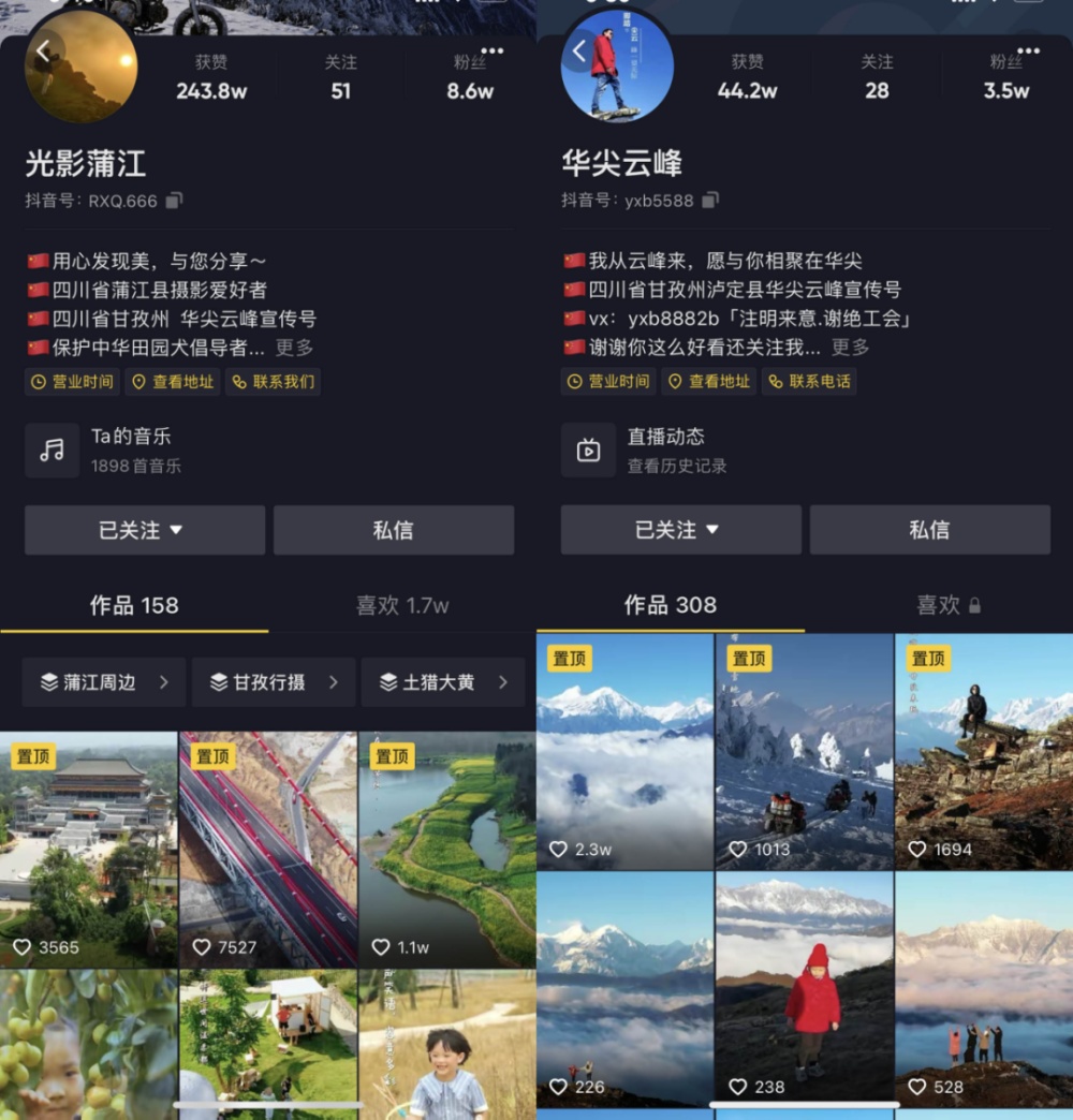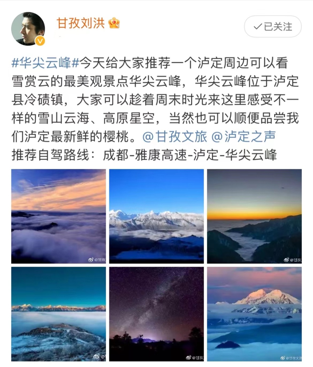 山顶的绝景,起初只是村民们随口一叫的“道堂子”,任显侨决定注册正式名称,形成品牌,于是起名为“华尖云峰”。任显侨和小波分别在抖音账号“光影蒲江”和“华尖云峰”宣传华尖云峰的美景,粉丝数超过了十万,每一条都有成百上千的点赞。