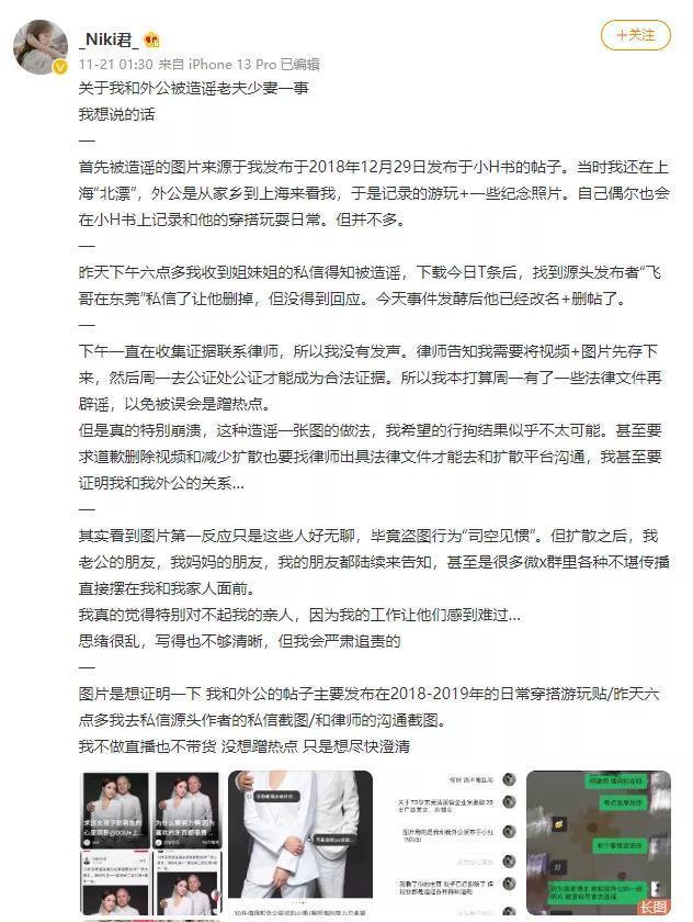 今天凌晨,名为_Niki君_ 的博主刊出长文,回应被造谣“老夫少妻”一事。