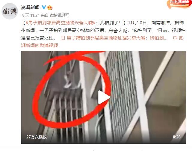 男子拍到邻居高空抛物证据 兴奋大喊:我拍到了!