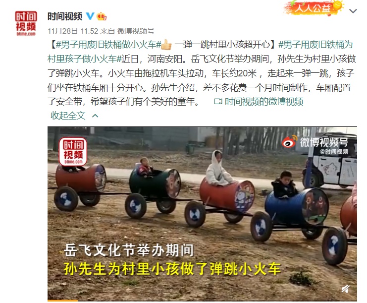 近日,河南安阳。岳飞文化节举办期间,孙先生为村里小孩做了弹跳小火车。小火车由拖拉机车头拉动,车长约20米 ,走起来一弹一跳,孩子们坐在铁桶车厢十分开心。孙先生介绍,差不多花费一个月时间制作,车厢配置了安全带,希望孩子们有个美好的童年。