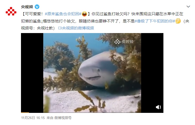 【可可爱爱!原来鲨鱼也会犯困】你见过鲨鱼打哈欠吗?快来围观这只藏在水草中正在犯懒的鲨鱼,慢悠悠地打个哈欠,眼睛仿佛也要睁不开了,是不是像极了下午犯困的你?