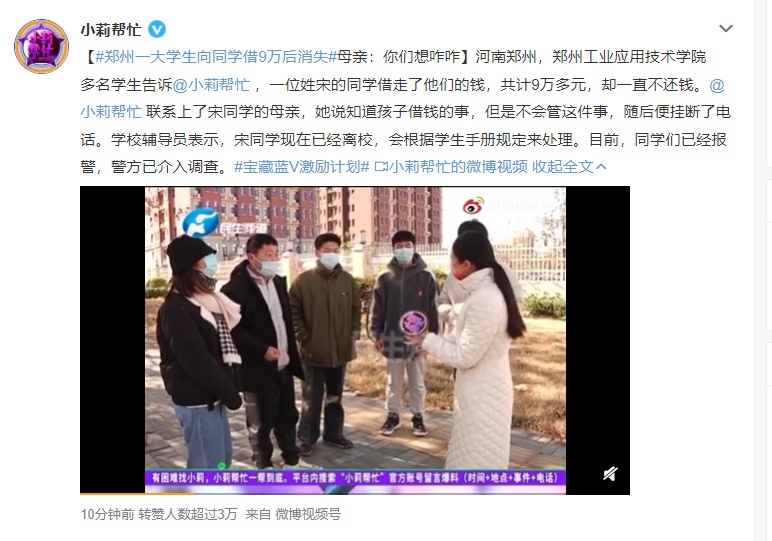 河南郑州,郑州工业应用技术学院多名学生告诉@小莉帮忙,一位姓宋的同学借走了他们的钱,共计9万多元,却一直不还钱。小莉帮忙联系上了宋同学的母亲,她说知道孩子借钱的事,但是不会管这件事,随后便挂断了电话。学校辅导员表示,宋同学现在已经离校,会根据学生手册规定来处理。目前,同学们已经报警,警方已介入调查。