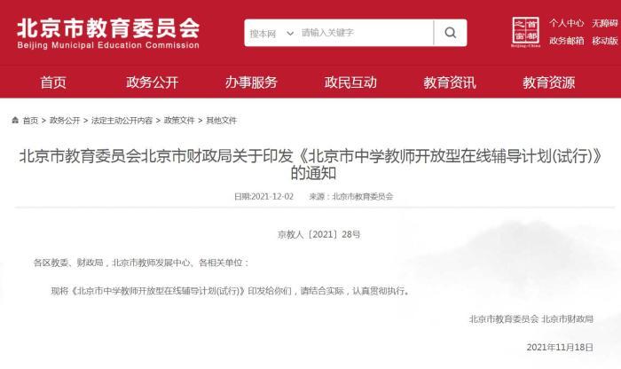 近日,北京市教育委员会、北京市财政局发布《北京市中学教师开放型在线辅导计划(试行)》(下称“《计划》”)。简单来说,这份文件意在让公办学校的名师为学生提供一对一、一对多在线辅导,来满足学生答疑解惑的刚性需求。