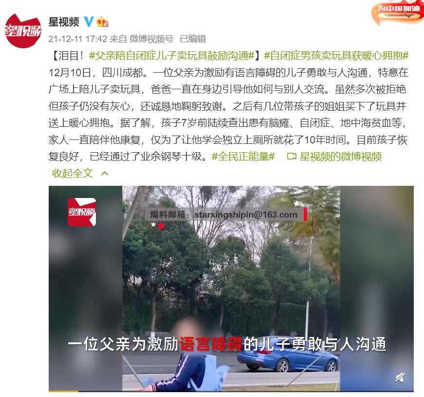 12月10日,四川成都。一位父亲为激励有语言障碍的儿子勇敢与人沟通,特意在广场上陪儿子卖玩具,爸爸一直在身边引导他如何与别人交流。虽然多次被拒绝但孩子仍没有灰心,还诚恳地鞠躬致谢。之后有几位带孩子的姐姐买下了玩具并送上暖心拥抱。